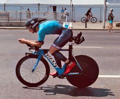 Auf dem Rad ärgerte ich mich noch kurz über die schlechte Schwimmleistung, kam dann aber schnell in Tritt und konnte auf der Mitteldistanz endlich einen Radsplit hinlegen, wie ich ihn mir wünsche. Die Strecke war komplett flach und bis auf einige Wendepunkte sehr gerade. Sie führte über relativ gute Landstraßen und mehrere Autobahnstücke rein in die Innenstadt von Warschau. Mit dem Zeitfahrrad in Aero-Position und bei 50 km/h über die Autobahn zu rasen war definitiv ein Highlight. Allerdings schien das Rennen, abgesehen von den Athleten, niemanden so richtig zu interessieren, denn Zuschauer standen so gut wie keine an der Strecke. Positiv hervorzuheben ist, dass auf der Strecke viele Kampfrichter unterwegs waren, die Drafting-Verstöße rigoros ahndeten. In der Innenstadt drehte man noch eine kleine Schleife und durfte dann das Rad in der zweiten Wechselzone parken. Das Radfahren lief für mich super und auch die Aero-Position, die ich mit Stephan letztes Jahr eingestellt hatte, ließ sich super fahren. Zum ersten Mal bin ich auf der Mitteldistanz einen 40er-Schnitt gefahren – das ist doch was!