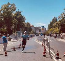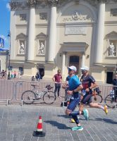 Beim Laufen spürte ich allerdings sofort, dass ich auf dem Rad Körner gelassen hatte. Zusätzlich machte mir die Hitze zu schaffen. Auf der 5km Wendepunktstrecke in der Altstadt gab es kein bisschen Schatten. Die ursprünglich angepeilte Pace konnte ich gar nicht erst erreichen, also versuchte ich wenigstens, eine solide 4:00er-Pace durchzulaufen. Zwischendurch war es ziemlich hart, und da das AK-Podium ohnehin in weiter Ferne lag, wurde es irgendwann auch mental sehr zäh. Ähnlich wie an der Radstrecke gab es keine Stimmung an der Strecke – die meisten Passanten waren eher genervt davon, dass sie die Straße nicht überqueren durften. Motivieren konnte ich mich nur noch mit dem Gedanken an kalte Getränke im Ziel. Nach der 4. Runde wurde ich schließlich erlöst und durfte in Richtung Finishline abbiegen. Im Ziel angekommen musste ich dann leider mit ansehen, wie ich aufgrund des Rolling-Starts noch von Platz 5 auf 9 in der Altersklasse durchgereicht wurde. Die Konkurrenz war an diesem Tag einfach zu stark.