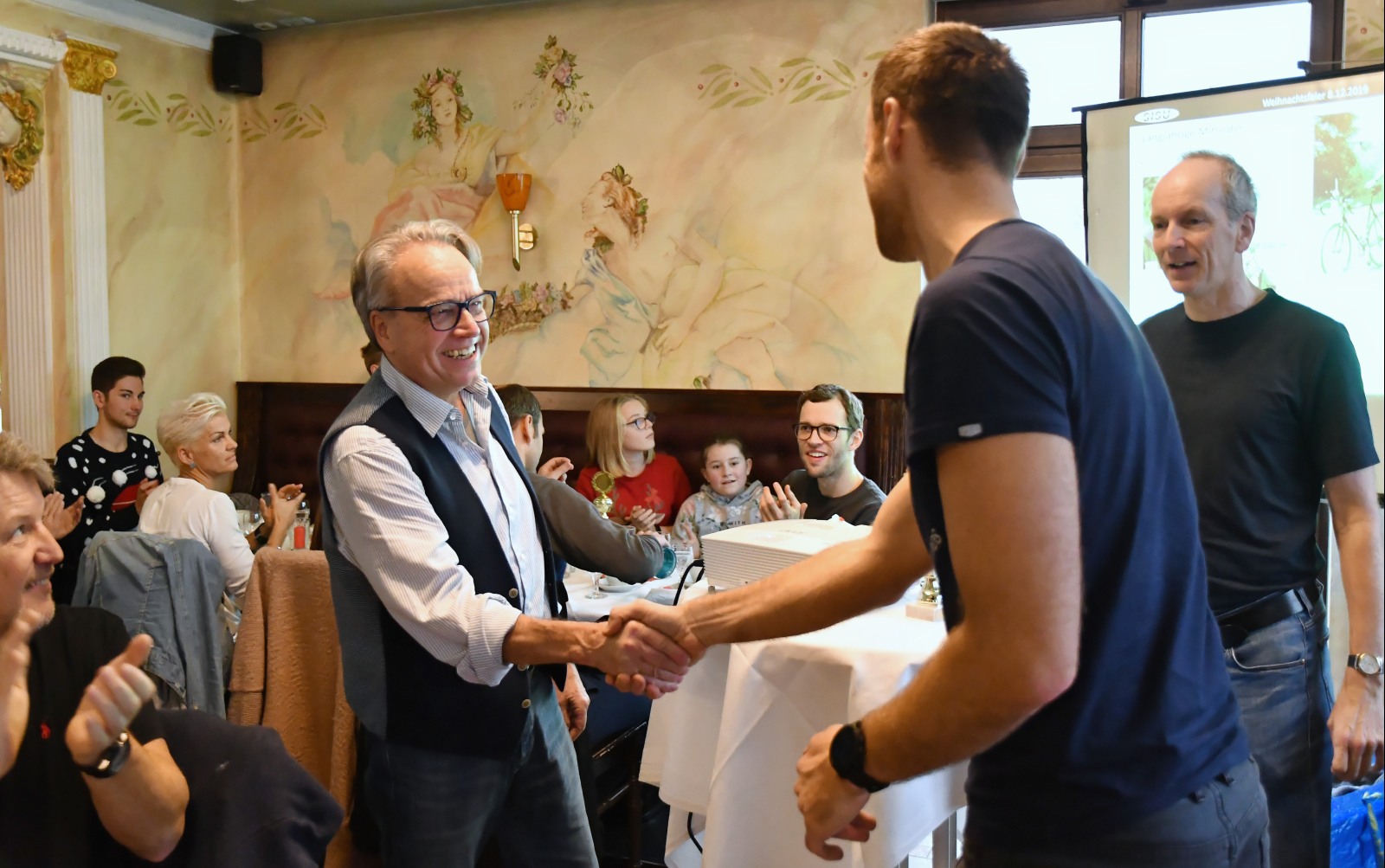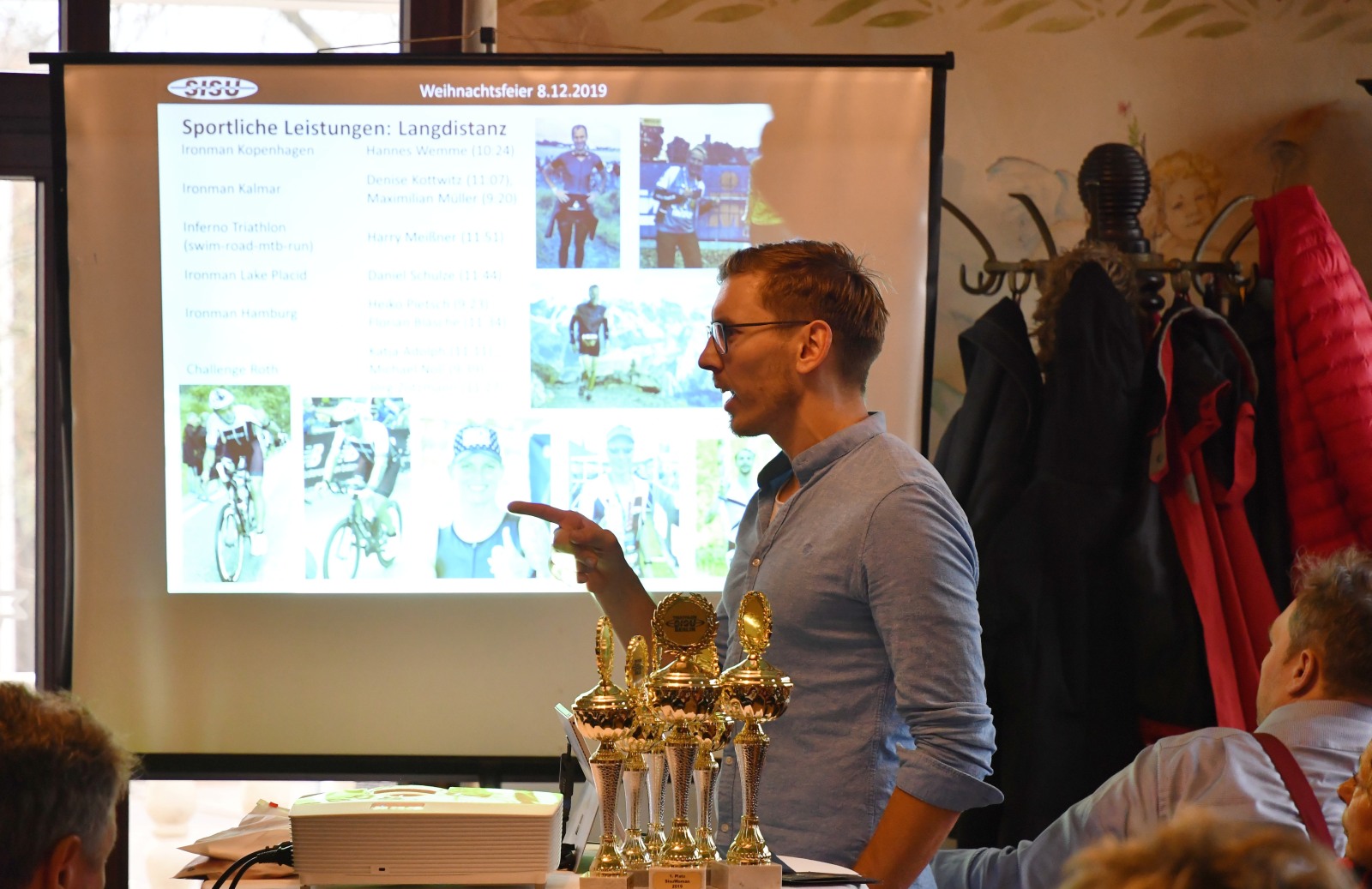 Unsere Jugendabteilung ist mittlerweile gut etabliert, und die Schüler und Jugendlichen haben mit einigem Erfolg an den regionalen Wettkämpfen teilgenommen. Jochen hatte sich wieder spezielle Präsente überlegt. Eine Liste von herausragenden und außergewöhnlichen Leistungen hatten wir ebenfalls zusammengestellt, darunter Meisterschaften und eine lange Liste von Ironman-Finishern. Jürgen und Klaus sind mittlerweile 30 Jahre bei Sisu. Jürgen war in früheren Jahren einer der Leistungsträger und ist immer noch sportlich aktiv.