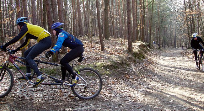 Der Berliner Winter-Triathlon entwickelt sich langsam zu einer festen Größe im sonst dünn besetzten Terminkalender zu dieser Jahreszeit. Das ist besonders positiv, da es in Berlin auch in der restlichen Saison nur wenige Wettkämpfe gibt. Diesmal war von vornherein eine Jugendwertung (halbe Strecke) und eine Tandemwertung angekündigt. Das Problem dabei waren in diesem Jahr allerdings die Tandems. Alle einschlägig bekannten Teams passten mal wieder, und Susi konnte auf Grund einer Verletzung nicht fahren. Eine auf Bitten des Orgateams durchgeführte Blitzumfrage beim Training ergab, dass Nana durchaus bereit wäre, es mal als Stokerin auf dem Tandem zu versuchen. 2 Trainings im Wald ergaben, dass es funktionieren würde, und zwar gar nicht schlecht. "Ist eigentlich wie auf der Rolle" gab die furchtlose Stokerin nach der ersten ernsthaften Geländefahrt zu Protokoll.