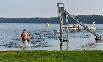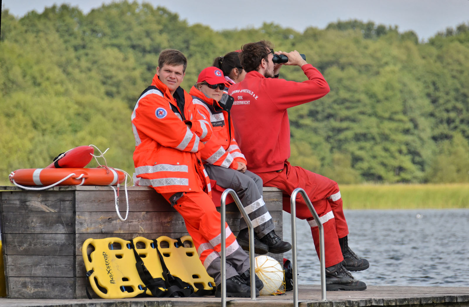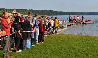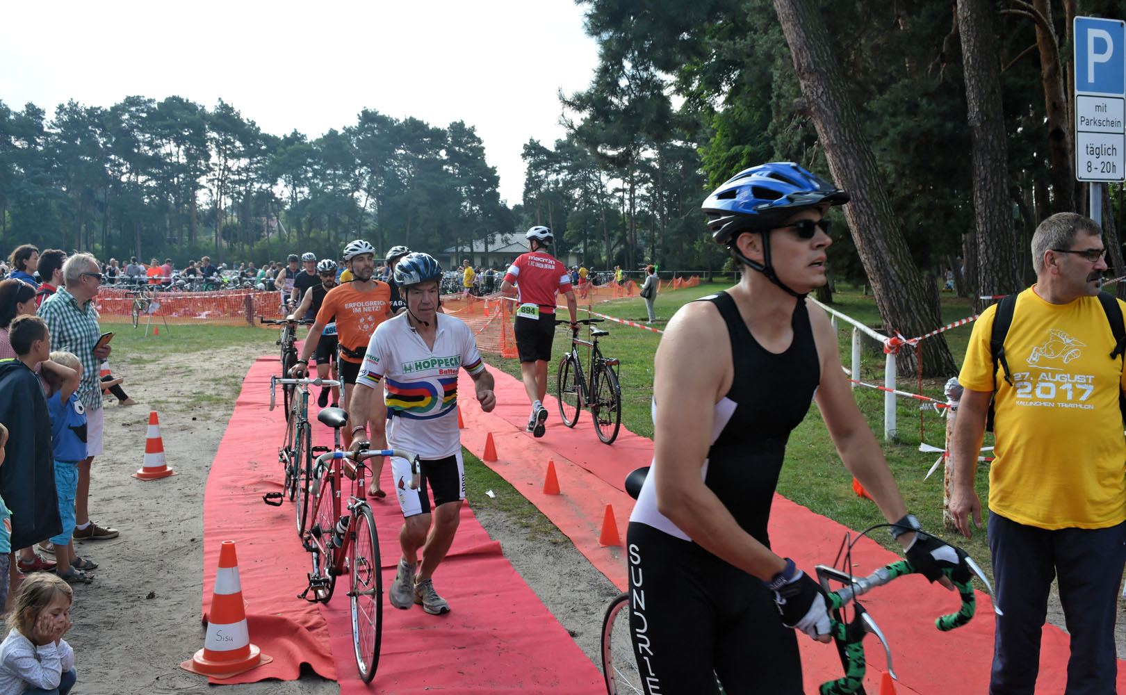 Der Sprint- oder Jedermann-Triathlon hat aufgrund der Rad- und Laufrunde in Kallinchen etwas Überlänge. Hier hatten wir dieses Jahr die größten Startgruppen, aber soweit wir es beobachten konnten, ging es diszipliniert und fair zu. Auf dieser Strecke schmolz der Startvorsprung der Damen schnell dahin und auf der Radstrecke durchmischte sich das Feld der Teilnehmer/innen.