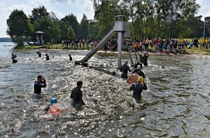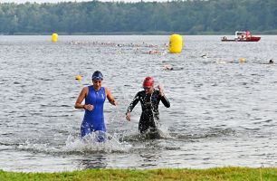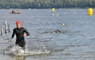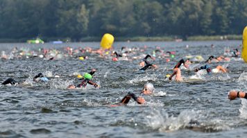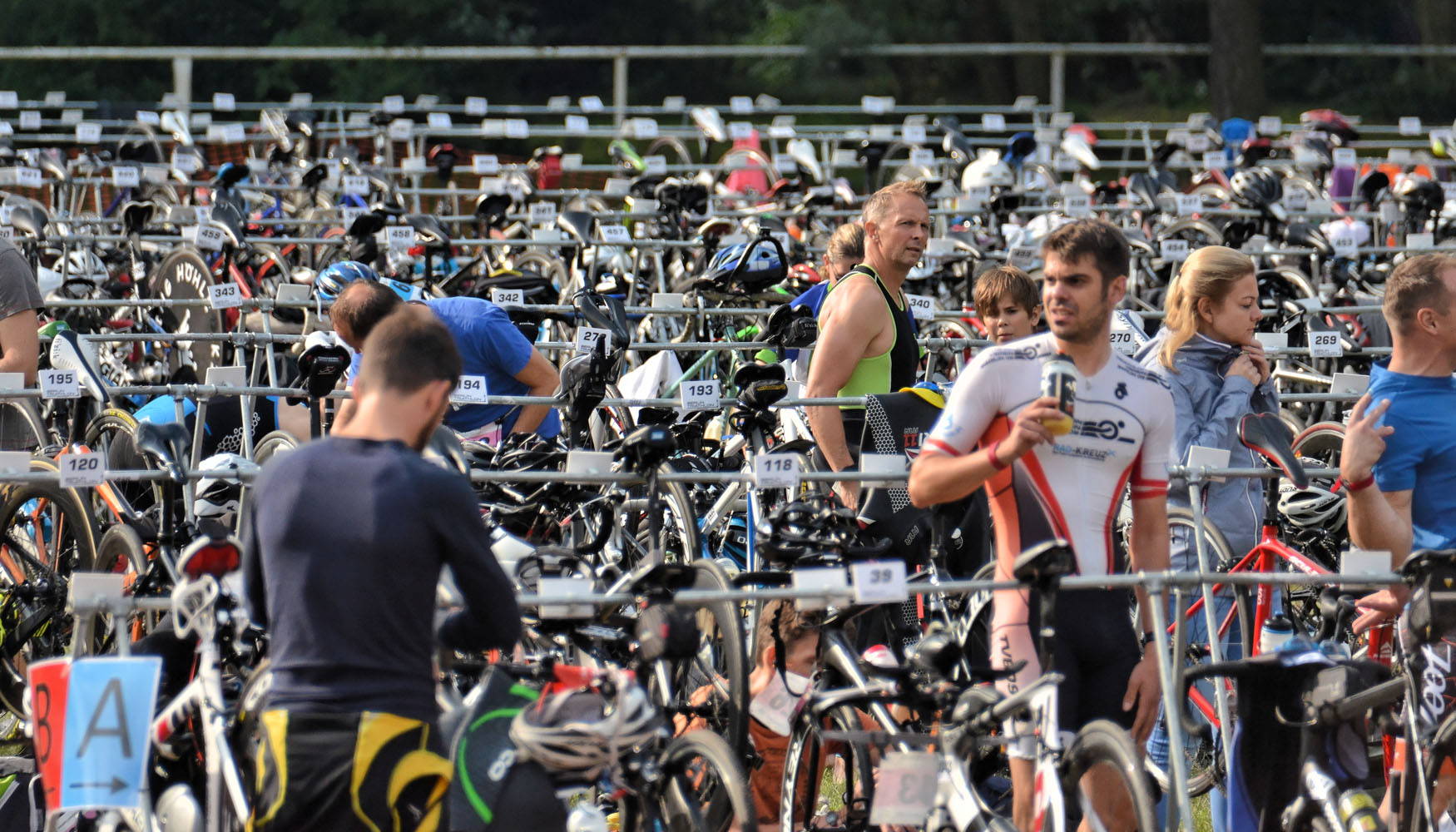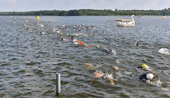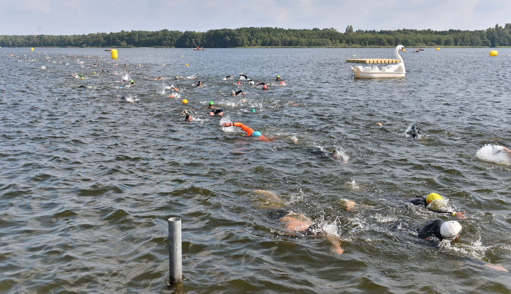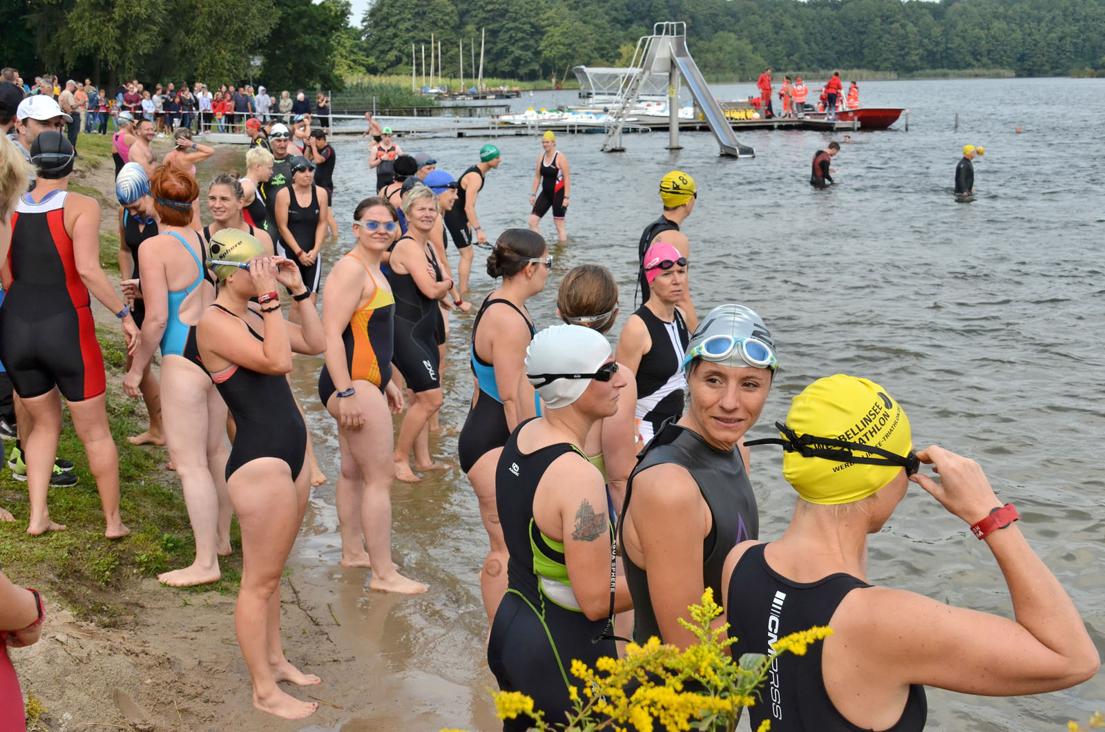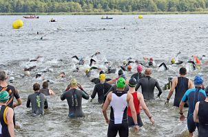 Die "Königsdisziplin" beim Kallinchen-Triathlon ist die olympische Distanz, die sich mit 1.500 m Schwimmen, 39 km Radfahren und 10 km Laufen auch eng an die Vorgaben der Sportordnung hält. 46 Frauen mit einem 20-minütigen Startvorsprung, gefolgt von der jagenden Meute von 202 Männern, stellten sich der Herausforderung. Die Schwimmstrecke durfte wie in allen Startwellen dank morgendlicher Kühle mit dem Neoprenanzug bewältigt werden. Auf der Radstrecke sah man allerlei Material vom teuren Carbon-Zeitfahr-"Geschoss" bis zum liebevoll gehegten Nostalgie-Renner.