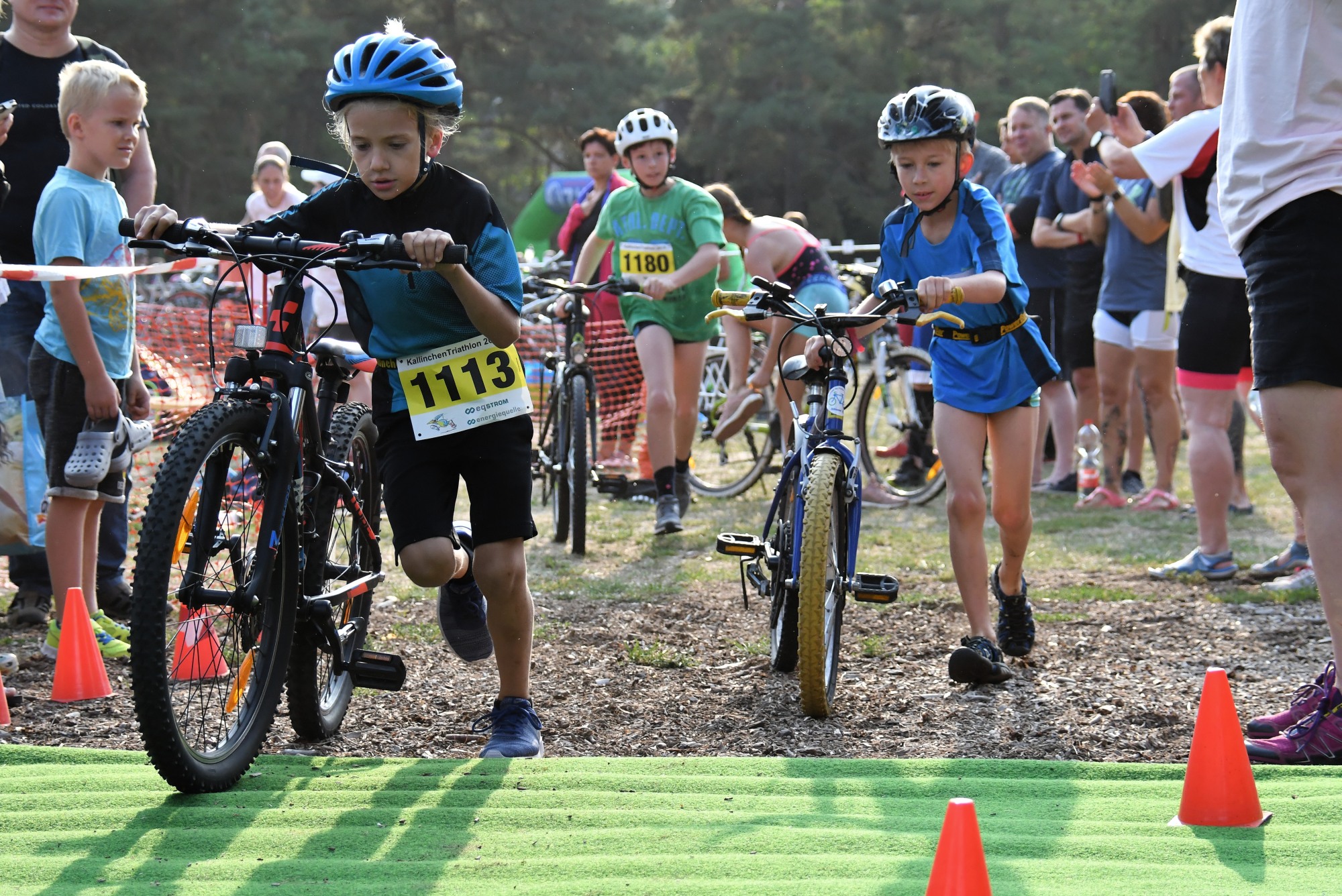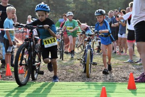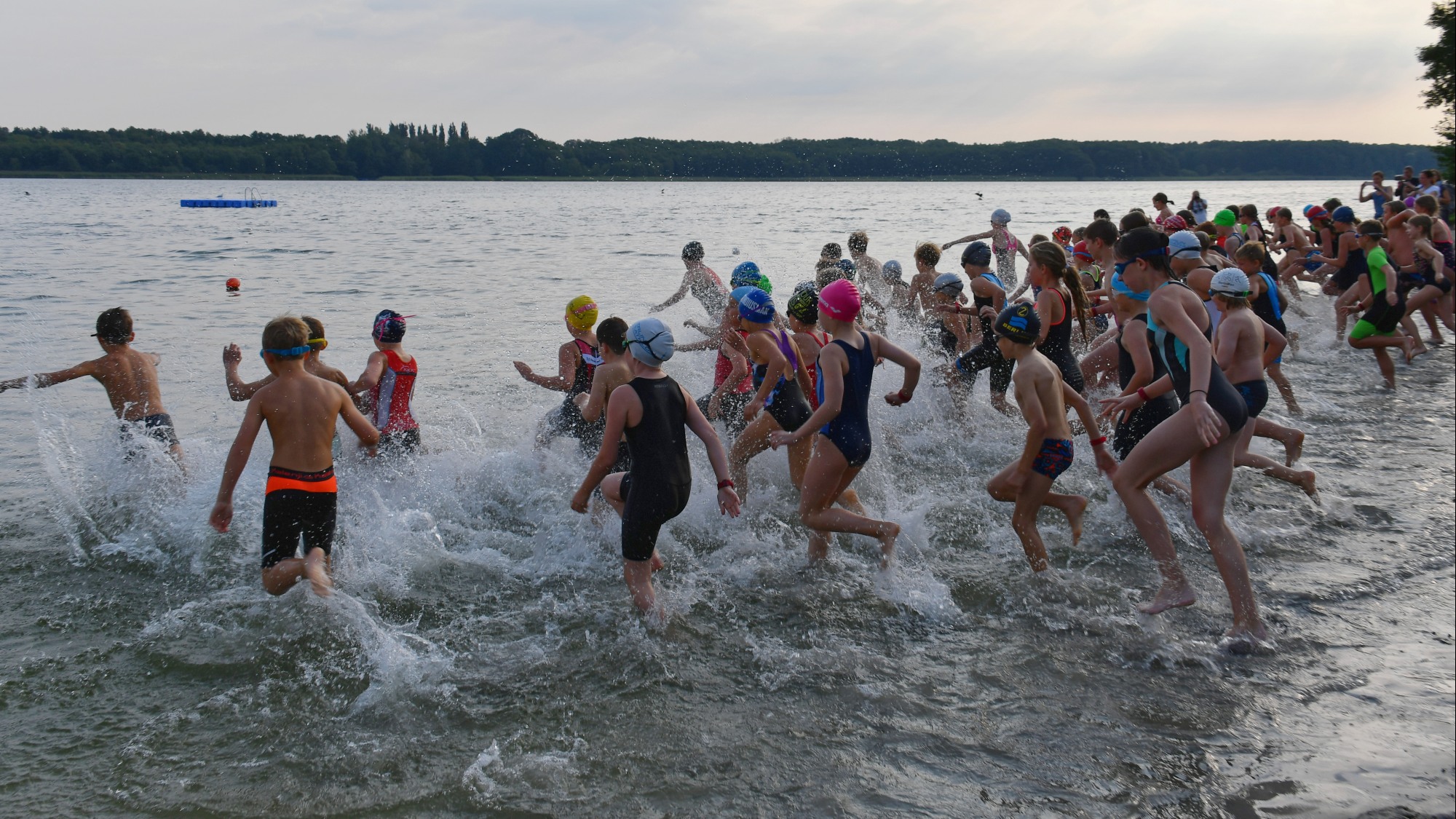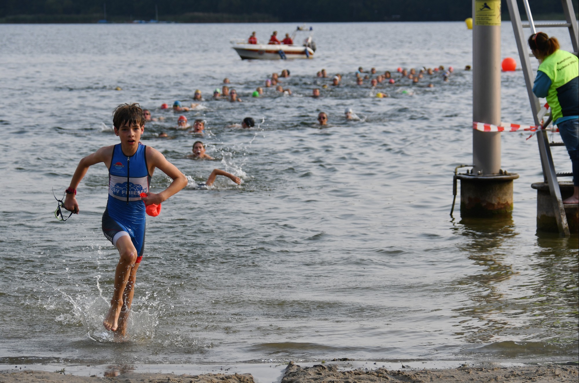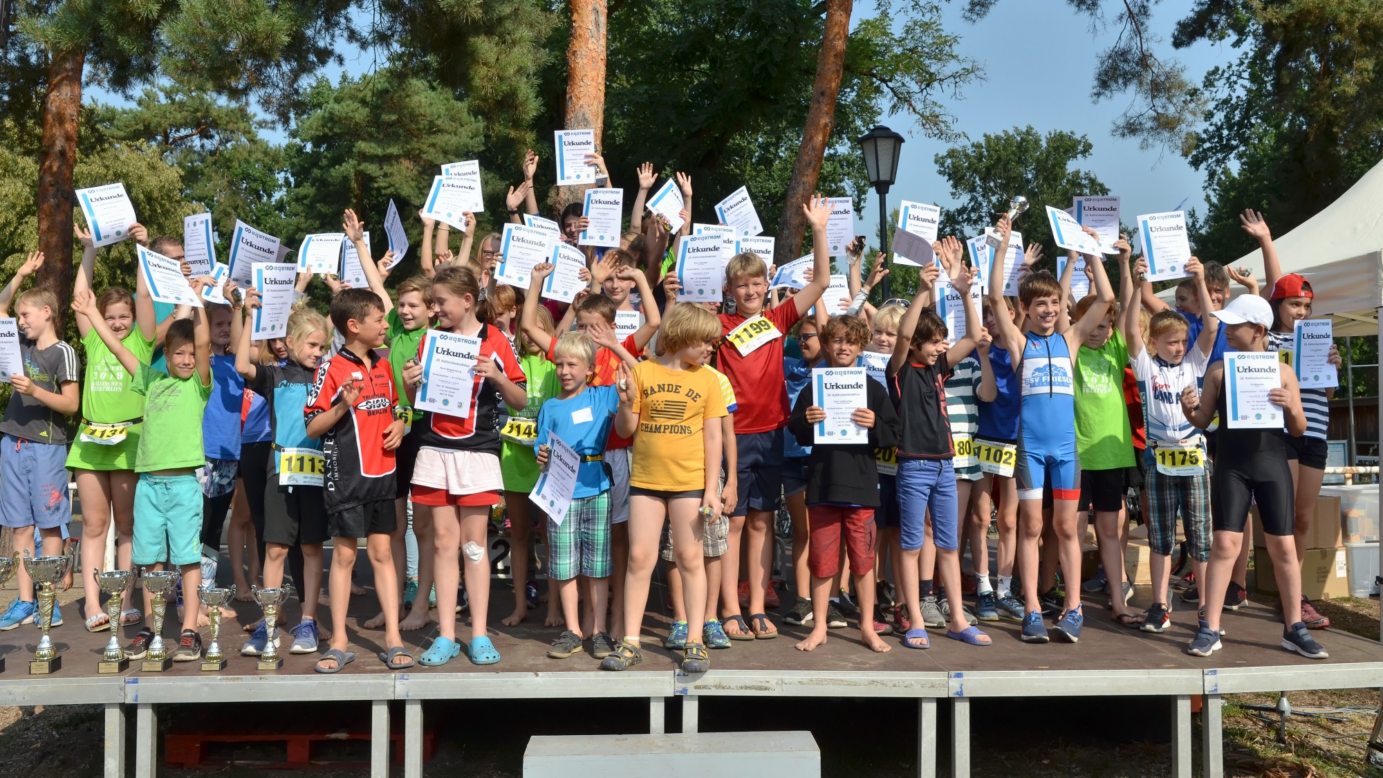 Rekord-Beteiligung beim Kinder-Tri – 78 Mädchen und Jungen von Schüler D (ab 6 Jahre) bis Jugend B (bis 15 Jahre) starteten als erste um kurz nach 8 Uhr morgens vom Strand des Kallinchiner Freibads in den Motzensee. Eine kurze Schwimmrunde, ein langer Spurt hinauf in den Wechselgarten, 2,5 Radkilometer durch Nebenstraßen und eine Laufrunde rund um und in den Zielbereich waren zu absolvieren. Etliche Erststarter waren darunter, aber auch viele bereits erfahrene Wettkämpfer mit Tempo-Ambitionen. Natürlich wurden die Besten auf dem Podium geehrt, doch zum Abschluss durften alle die Bühne erklimmen.