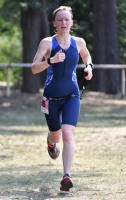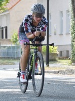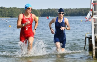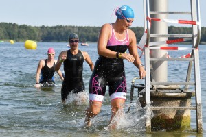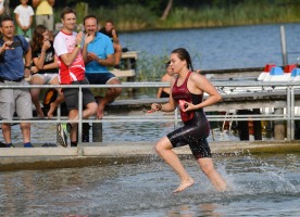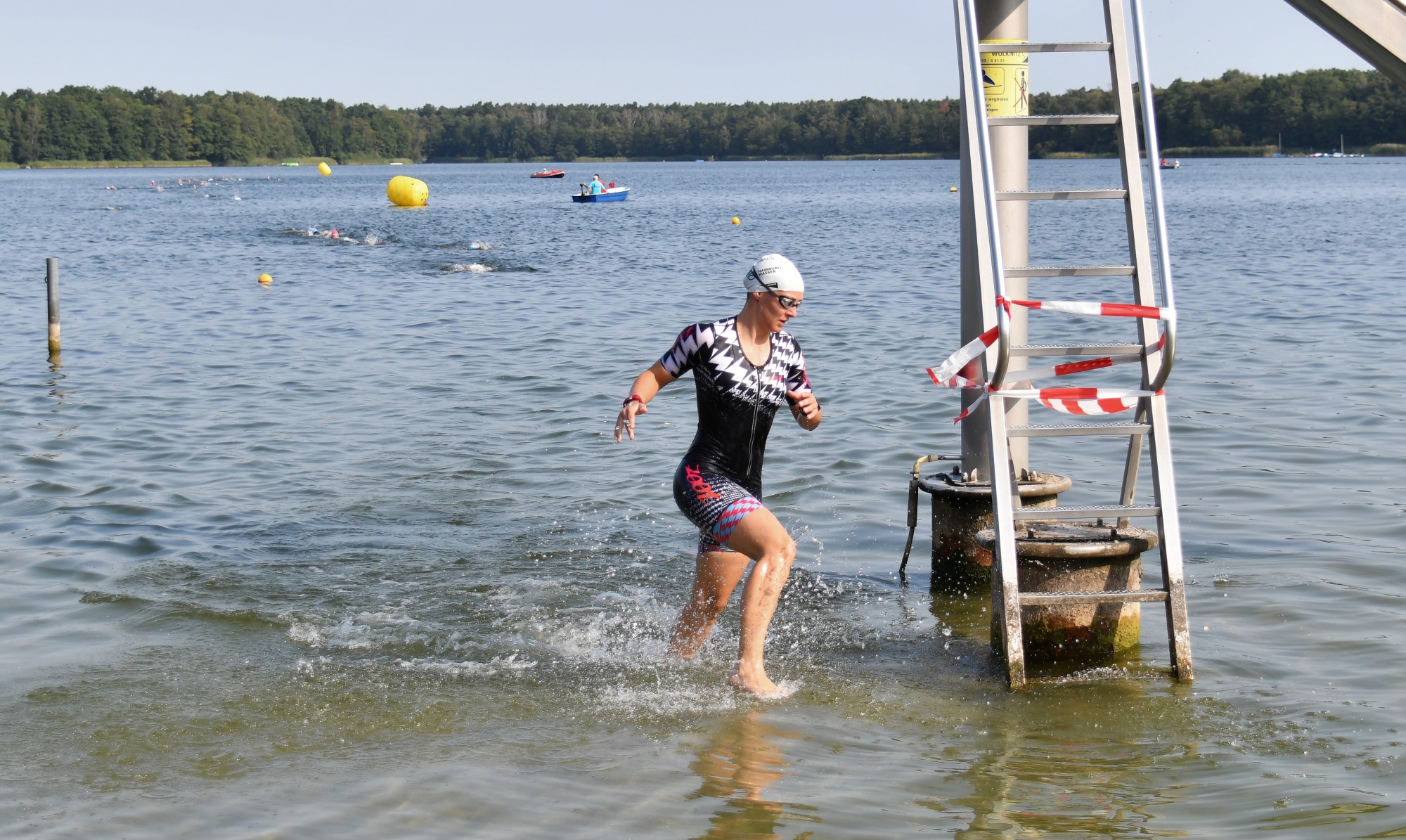 Die Frauen waren alle auf ihrer zweiten Runde, die Spitze schon in Richtung Radstrecke, als die Männerwelle in den See sprintete. Theresa Klein vom Berliner TSC hatte einigen Vorsprung nach dem Schwimmen, den sie bis zum zweiten Wechsel halten konnte. Katrin Burow, in den letzten Jahren als Ultra-Distanz-Triathletin bekannt, fuhr anschließend mit der besten Radzeit auf den Silberplatz vor, Jen Metcalf auf den dritten Platz. Dahinter ging es knapp zu.