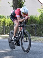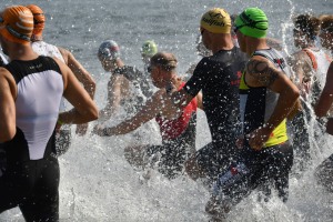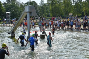 Zum Hauptwettkampf über die olympische Distanz (aber wie alle anderen Wettkämfe hier ohne Winschattenfahren) gingen die Altersklasse- und Elite-Triathleten an den Start. Das relativ übersichtliche Frauenfeld mit 50 Starterinnen ging um 10 Uhr mit einer halben Stunden Vorsprung auf die Männer ins Rennen. Ohne Neo und mit einer sehr ehrlich langen Schwimmrunde wurden im Wasser keine neuen Rekorde erzielt. Die Zuschauer hatten wie immer ihren Spaß beim Rundendurchgang an der Wasserrutsche, die dieses Jahr wieder etwas weiter im Wasser stand als im rekordtrockenen Sommer letztes Jahr.