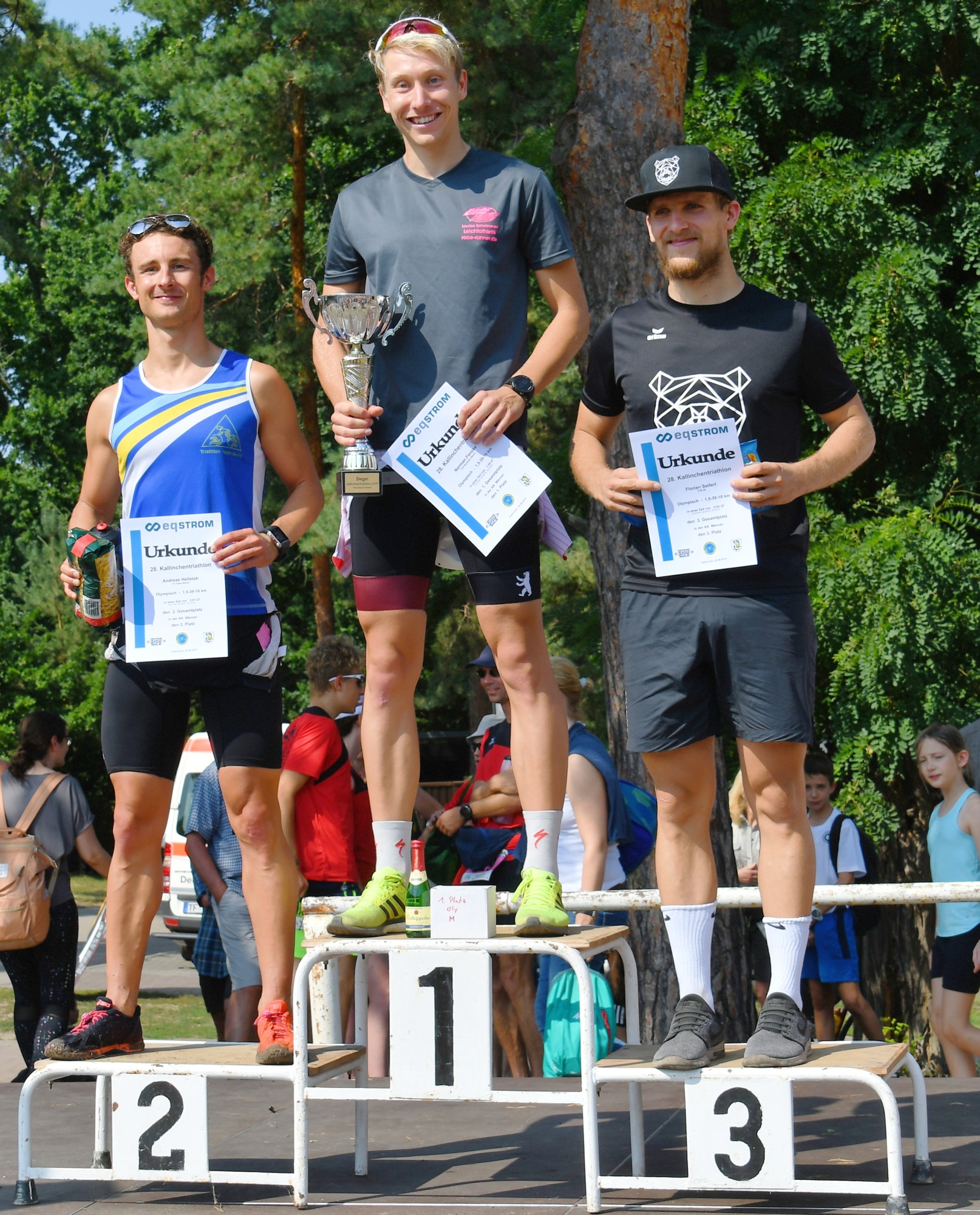 Bei den Männern war das Podium im Grunde nach dem Schwimmen schon besiegelt, es ging nur noch um die Reihenfolge. Dahinter klaffte bereits eine ordentliche Lücke, die auf dem Rad noch größer wurde. Norman Fenske (TuS Neukölln) fuhr eine der schnellsten Radzeiten, die wir hier bislang gesehen haben und nur ganz knapp über Streckenrekord. Das war schon die Entscheidung, auch beim Lauf ließ er schließlich mit dem besten Split nichts mehr anbrennen.