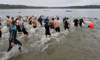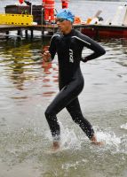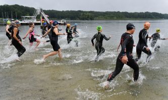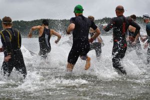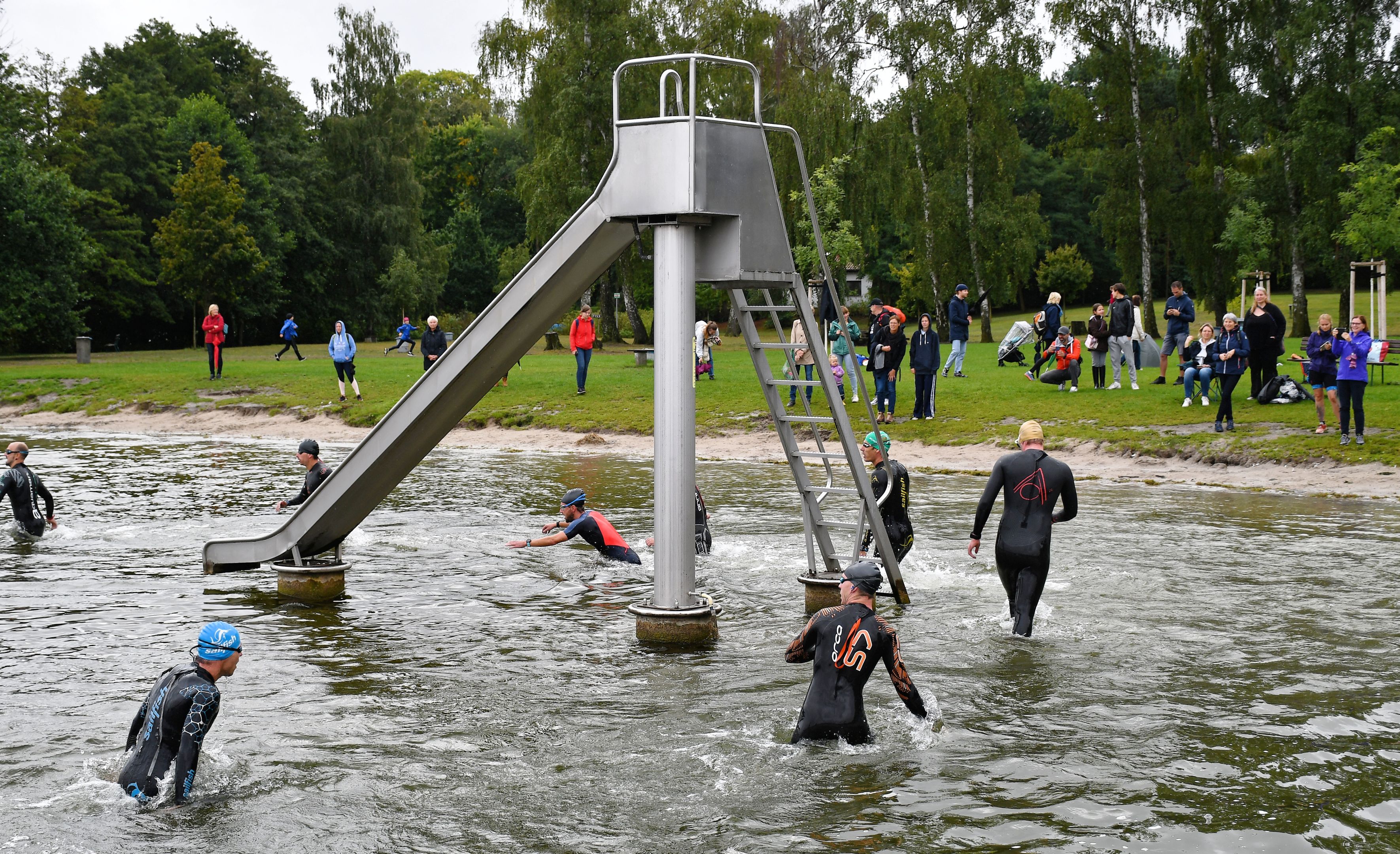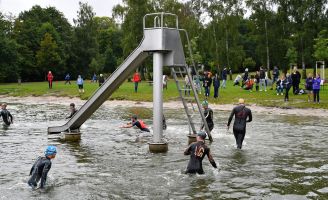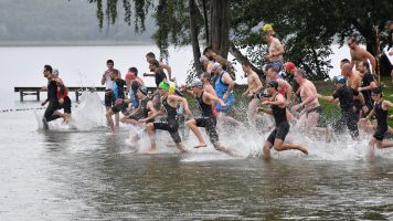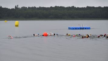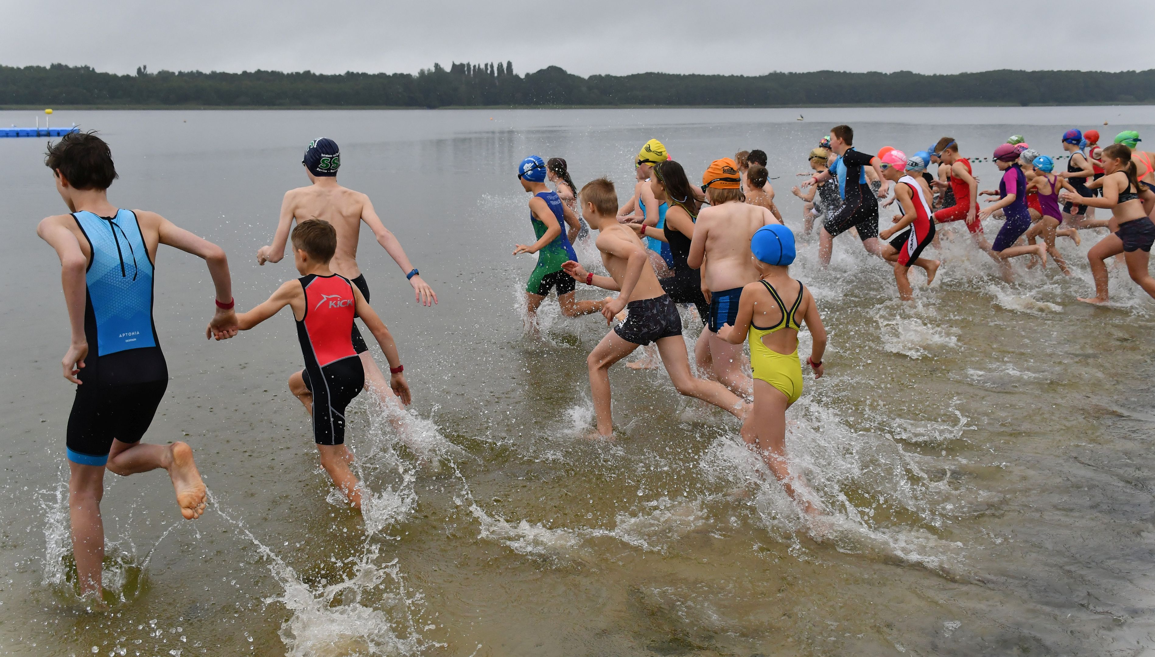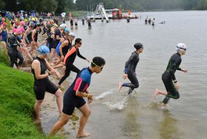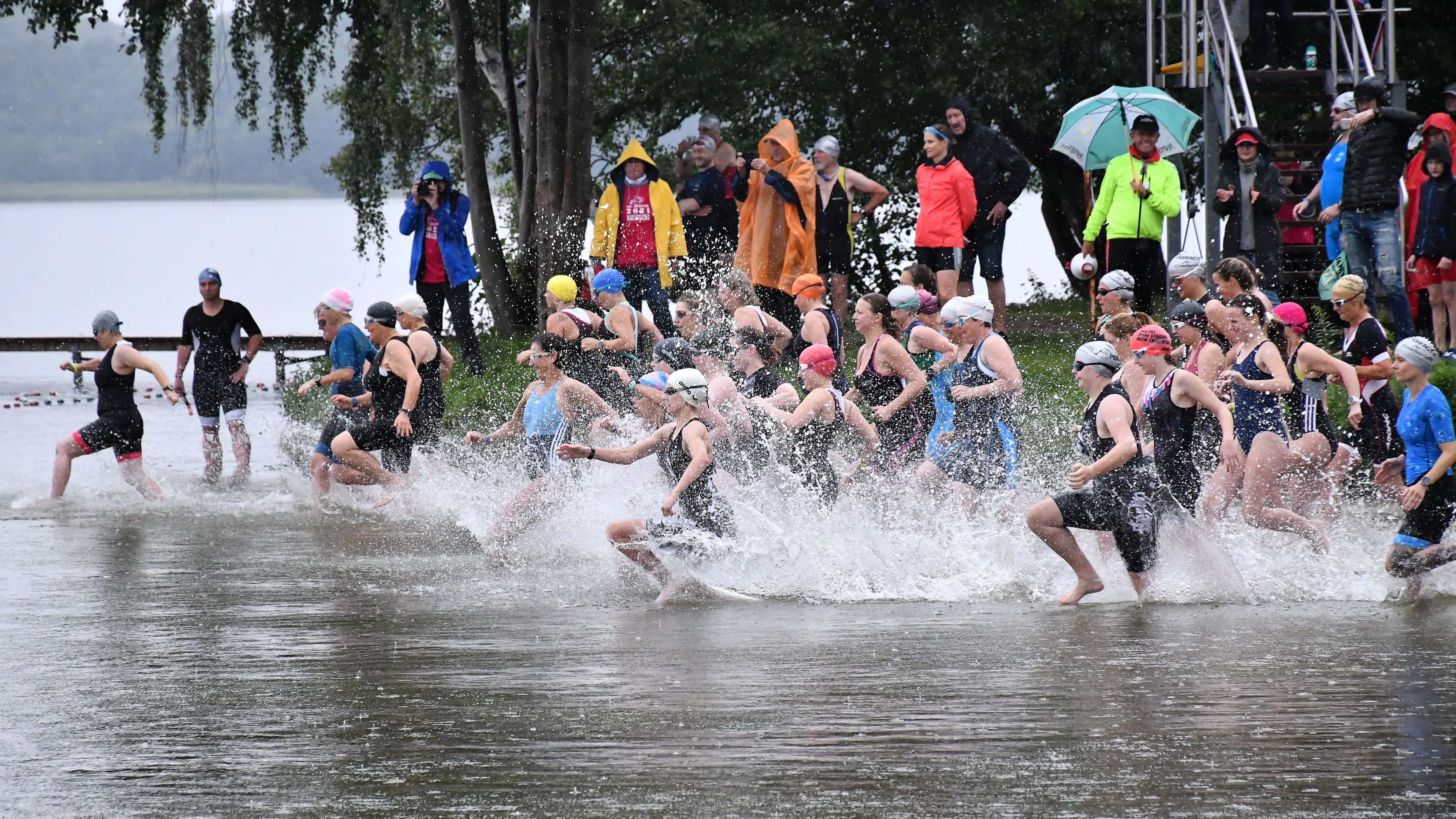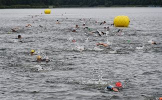 Die Sprinter verdoppeln die Strecken und rannten ebenfalls mit viel Schaum und Spritz in den See und umrundeten auf ihrer Dreiviertelkilometerrunde alle Bojen.