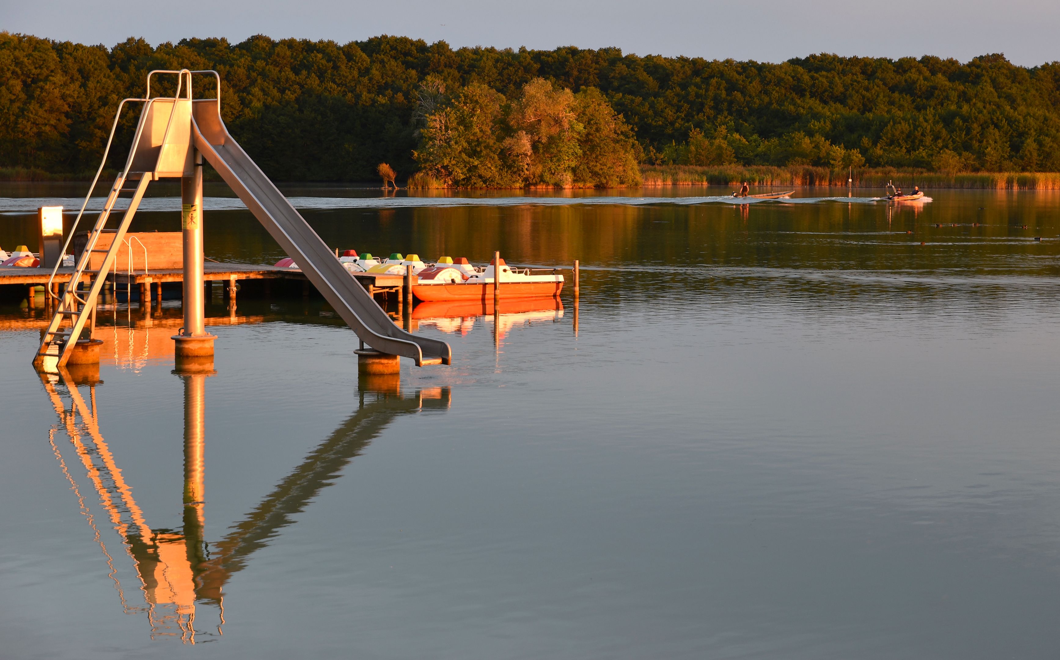 Die Kinder müssen wie üblich als erste schon um 8:20 ran. Nach einer kleinen Schwimmrunde um Ponton und Rutsche folgt wie bei den Großen der Lauf rauf zur Wechselzone (der nirgends auftaucht, aber fast als 4. Disziplin gelten kann). Die Radstrecke ist nur bei diesem Wettkampf komplett gesperrt und führt über die spätere Laufstrecke. Eine Runde um und durch den Wechselgarten führt schließlich ins Ziel.