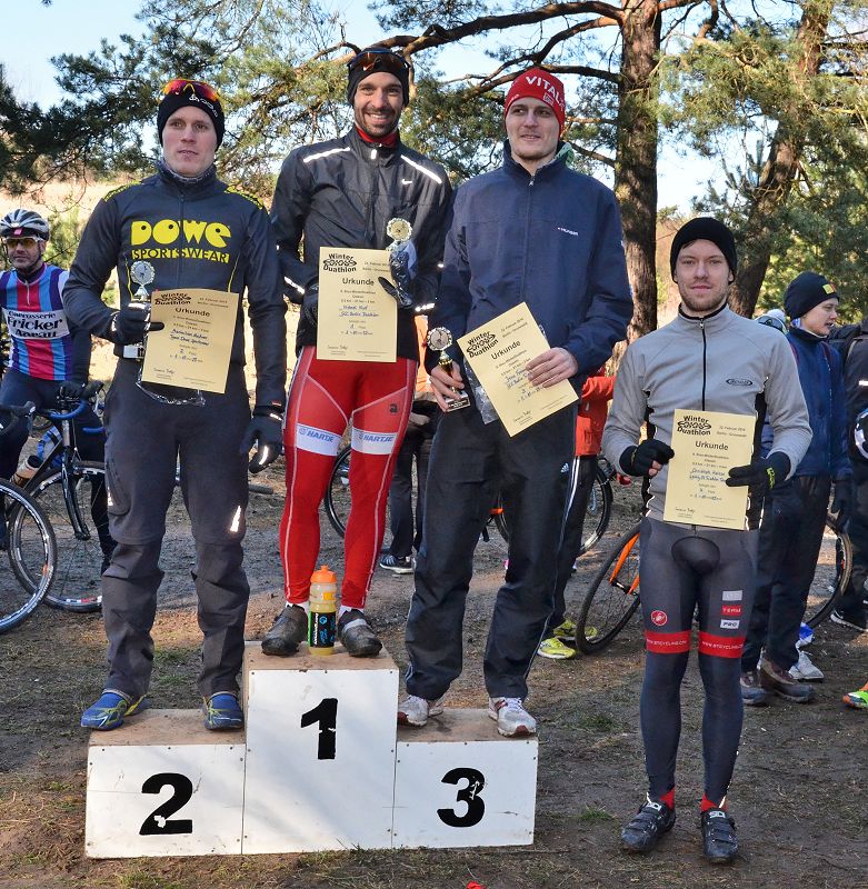 Michael Kopf (SCC) holte sich wiederum in überlegener Manier mit neuem Streckenrekord den Hattrick. Nach dem ersten Lauf betrug sein Vorsprung gerade 5 Sekunden, und die ersten 6 lagen innerhalb einer Minute. Doch auf dem Rad gab er vom ersten Meter an Vollgas und ließ allen anderen Podiumskandidaten keine Chance. Die Radzeit war die beste in der bisherigen Geschichte von Winter-Triathlon und -Duathlon. Maximilian Meißner (Team Dowe Sportswear) fiel auf dem Rad zwar auf Rang 9 zurück, kämpfte sich im 2. Lauf mit einer wiederum hervorragenden Zeit zurück auf den Silberplatz. Jens Frommhold (SCC) zeigte keine Schwächen und konnte sich mit Laufbestzeit hintenraus ebenfalls noch auf dem Podium platzieren. Überhaupt war das Männerfeld sehr hochklassig besetzt, sowohl mit Triathleten als auch mit reinen Duathleten und Radcrossern.