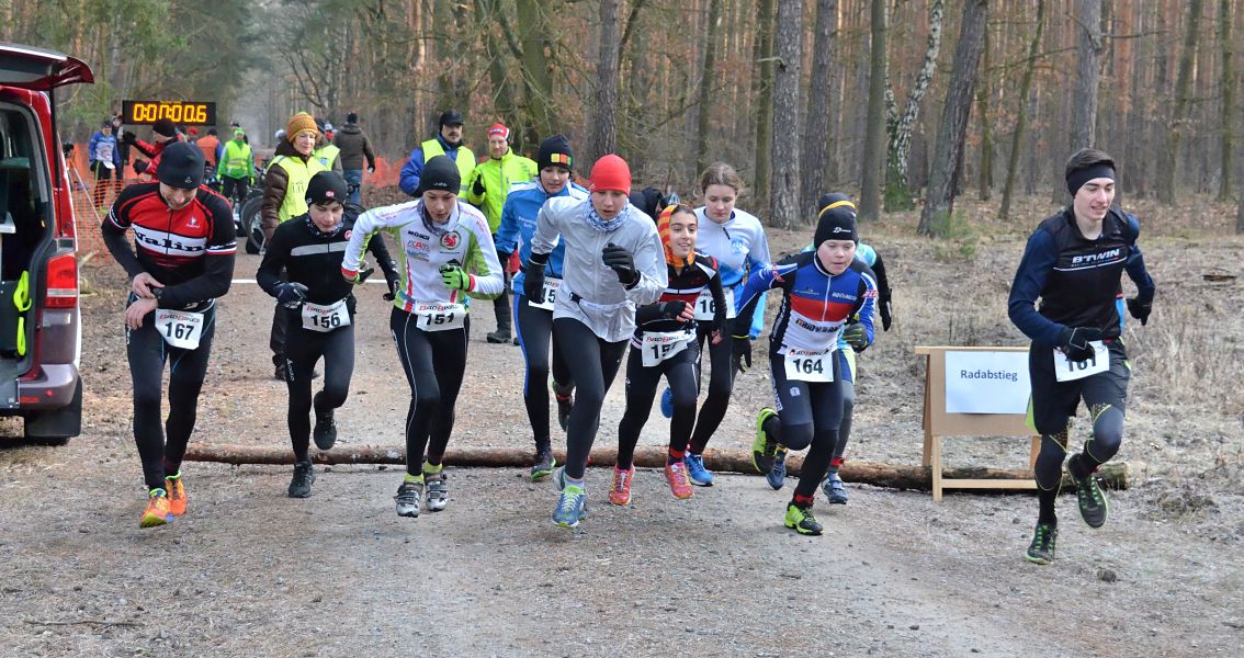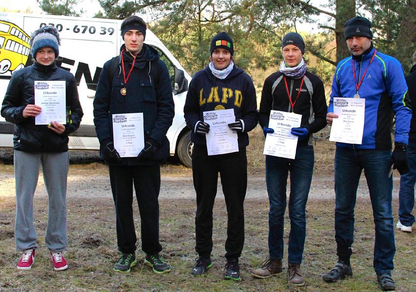 10 zumeist junge Duathleten gingen eine Stunde vor dem Hauptwettkampf auf die auch schon klassische shorty-Strecke. Bei Temperaturen von knapp unter Null Grad war die Strecke fest und schnell. Nach den 3 Radrunden war ein Posten nicht auf demselben, so dass die zweite Laufstrecke auch 2 km lang wurde – aber alle haben das gemeistert. Entschuldigung und Glückwunsch. Gesiegt haben Jadwiga Wyrwinska aus Poznan und Nils Andratschke von den Berliner Weltraumjoggern.