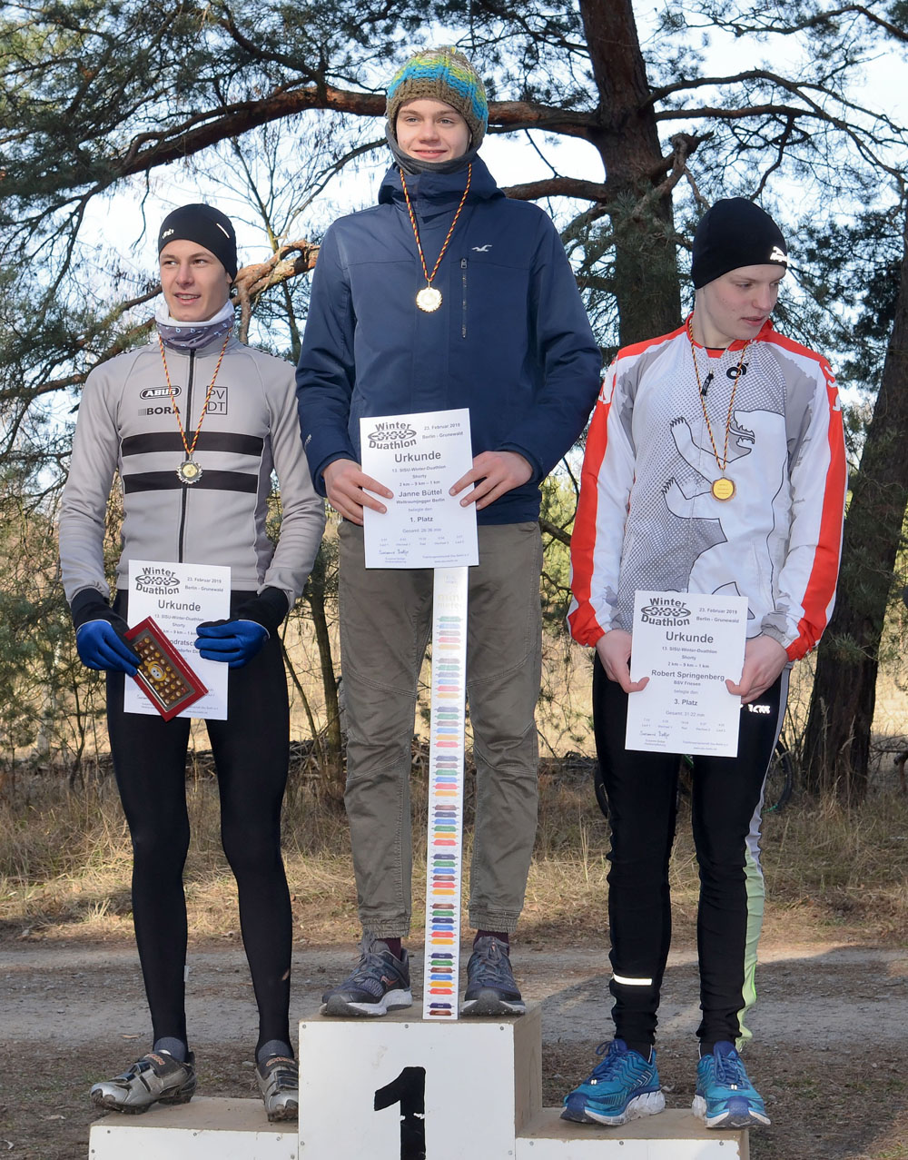 In der Spitze war der shorty bei Jungens wie Mädchen hochklassig besetzt. Janne Büttel (Weltraumjogger) setzte sich schnell vom Feld ab und verblüffte uns mit einer Zeit von knapp 6 Minuten für die ersten beiden Laufkilometer. Oskar Meinusch (SCC TriKids) hatte noch Tuchfühlung, dahinter hatten die Verfolger bereits einigen Rückstand. Nils Andratschke (Zehlendorfer Eichhörnchen) lief wie immer gleich mit Radschuhen und fuhr auf den zweiten Platz vor, den er dann halten konnte. Robert Springenberg (BSV Friesen) schaffte per Rad und mit sehr schnellen Wechseln den Sprung aufs Podium.
