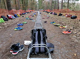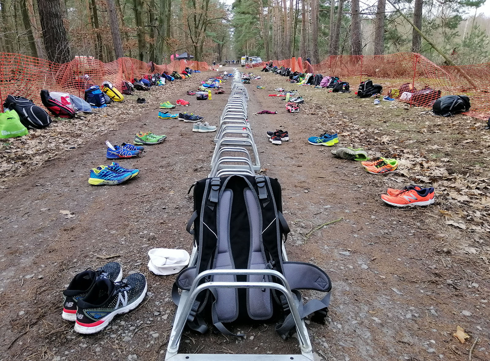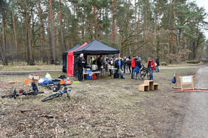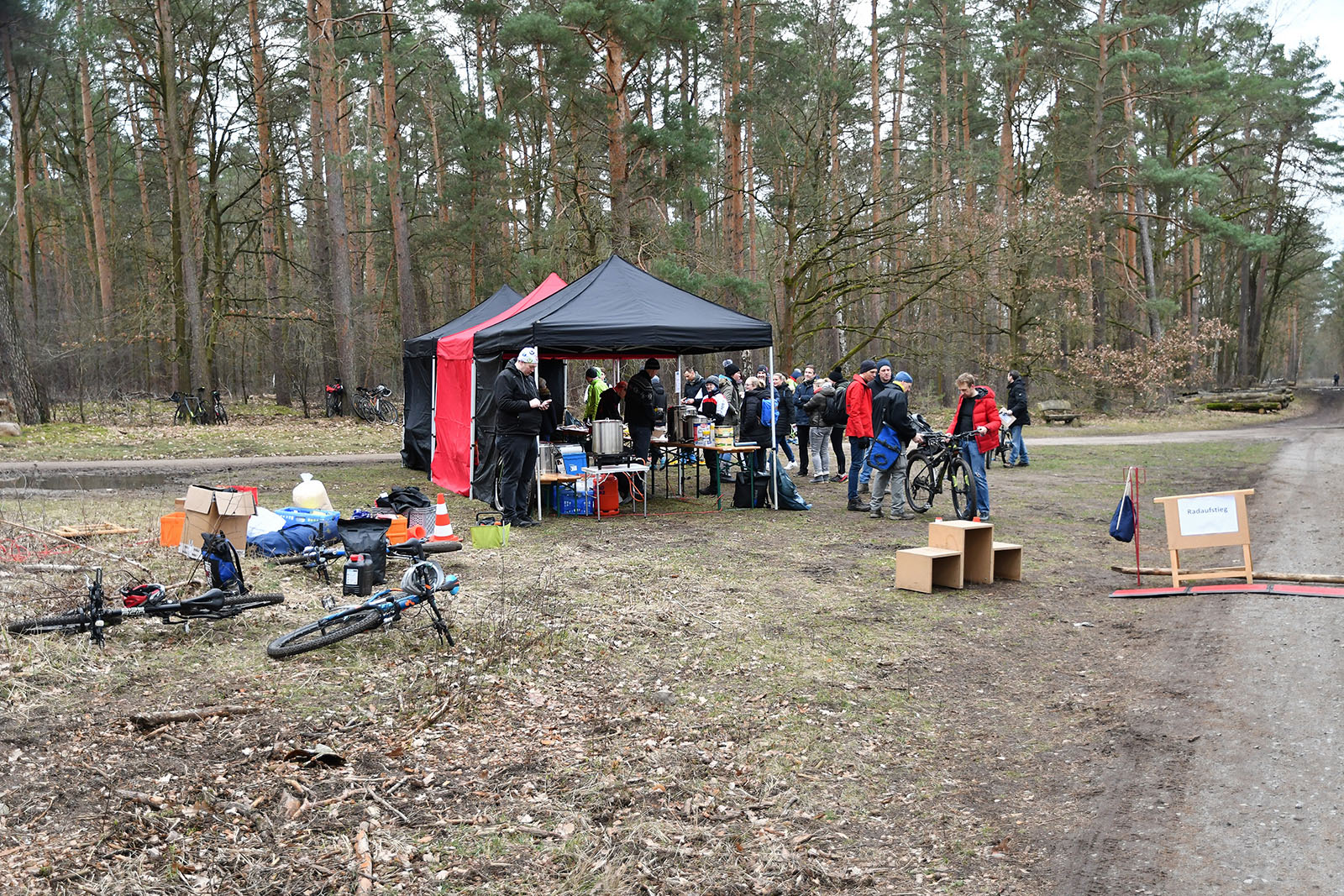 Der wärmste Winter seit WinterDu-Gedenken ließ dieses Jahr keinen Zweifel aufkommen, dass irgendetwas gefroren sein könnte oder Schnee fallen würde. Hatten wir bislang in fast allen Jahren bis eine Woche vor dem Rennen eine Eisplatte im Wald, so konnten wir dieses Jahr ganz undigital und nach Belieben im Gelände trainieren. Der Regen kam auch mal wieder später, so dass es sogar trocken blieb, nur einmal ist uns das Orgazelt weggeweht, nächstes Jahr werden wir das Zelt am Boden festnageln.